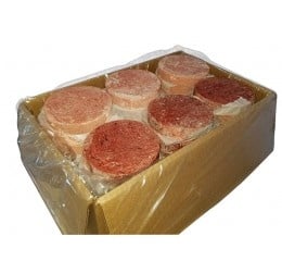 50 frozen 1/2lb patties of finely ground raw whole animal carcass (including muscle meat, bones, and organs). These patties do not contain any added fruit or vegetable matter.