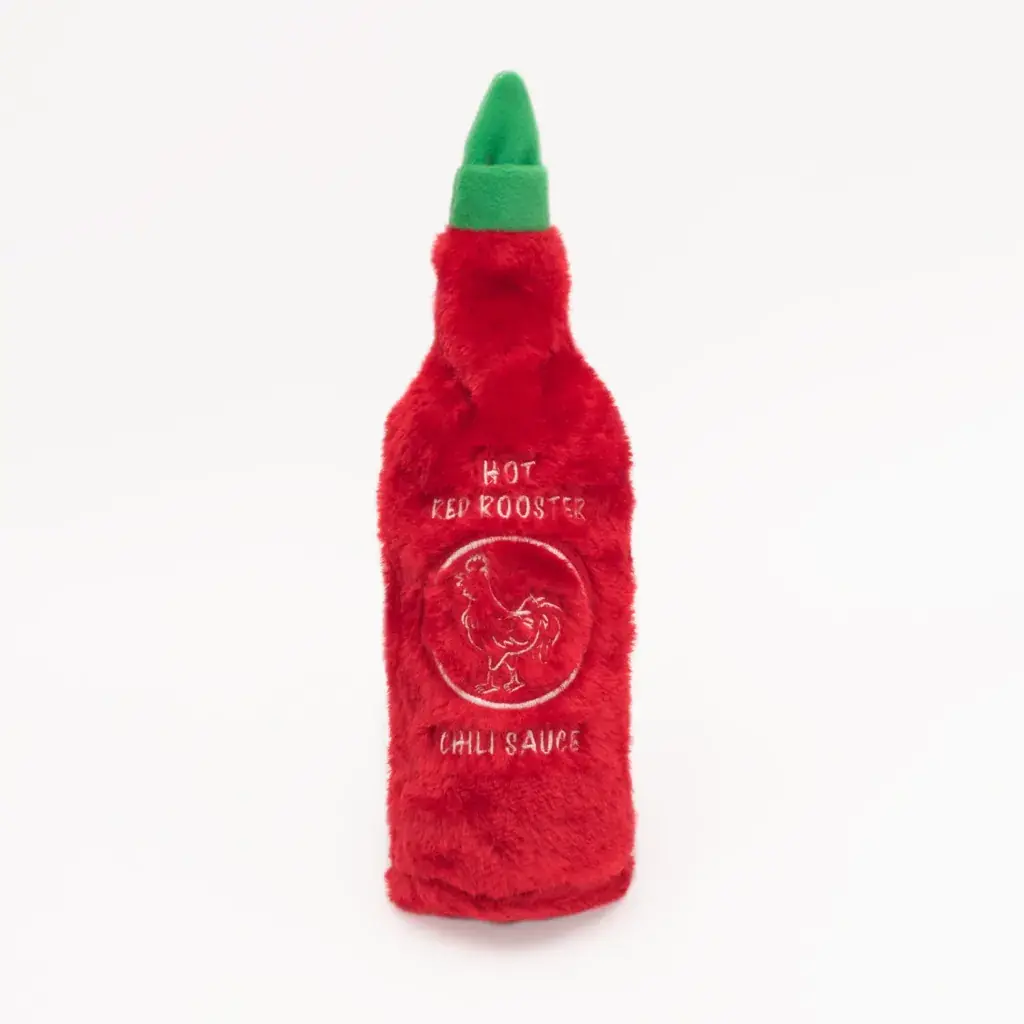 This hot sauce plushie is a soft, fuzzy, no-stuffing toy that has a built-in water bottle inside with a re-useable bottle cap squeaker that can be removed and placed onto any water bottle. Perfect for dogs who enjoy playing with water bottles.