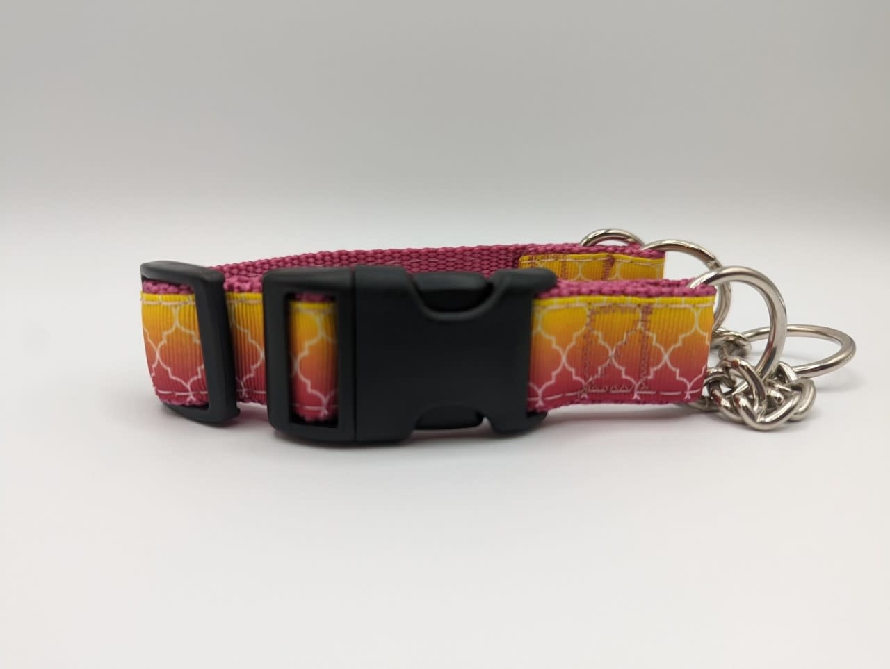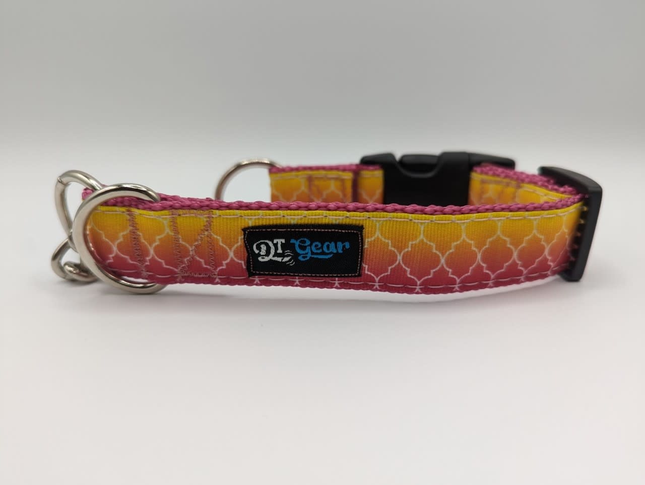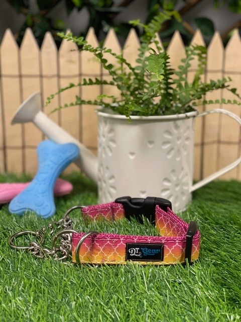 Quick Release Martingale Collar Handmade in Calgary, DT Gear takes great care to provide quality material with quality stitching . Many ribbon and webbing designs are available, full book of options available in store.