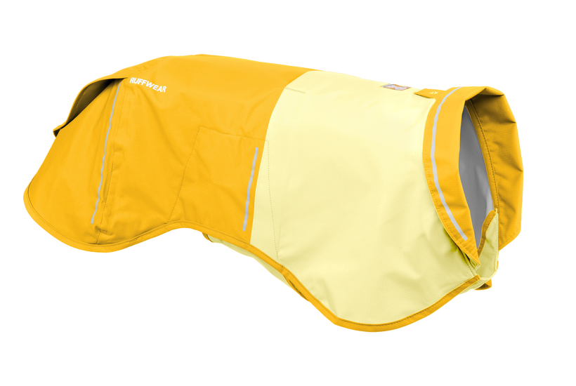 The Sun Shower Jacket is windproof and waterproof. The oversized storm collar folds up for weather protection and the leash portal fits over harnesses. Leg loops provide a secure fit option, reflective accents create visibility in low-light conditions.