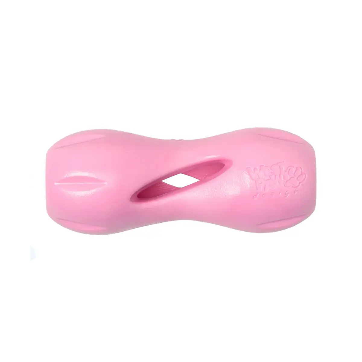 The side openings release scent and taste while the continuous interior hole allows treats to extend out. Flexible ridges grip multiple sizes of treats. One of our toughest dog toys, Qwizl is also fun to toss, fetch, and chew even after the treats are gone. Curved shape makes toy easy for dogs to hold in place with paws.
